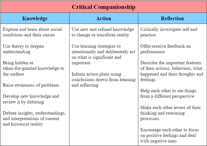 Critical companionships are educational and empowering exchanges of feelings, thoughts, knowledge, interpretations, and actions. They promote expression, intuition, and creativity. They are analytical and evaluative. They value all knowledge/evidence equally.
