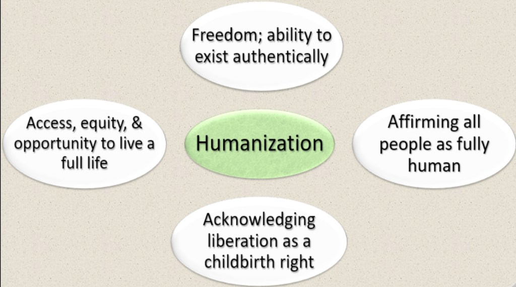 Paulo Freire says, “Concern for humanization leads at once to the recognition of dehumanization.” Our deep understanding of this concept is required to pursue full humanity. To be concerned about humanization means you are aware of what it is. At some level, you can identify and recognize when a person is being humanized or dehumanized, even if you have not experienced either of them personally.