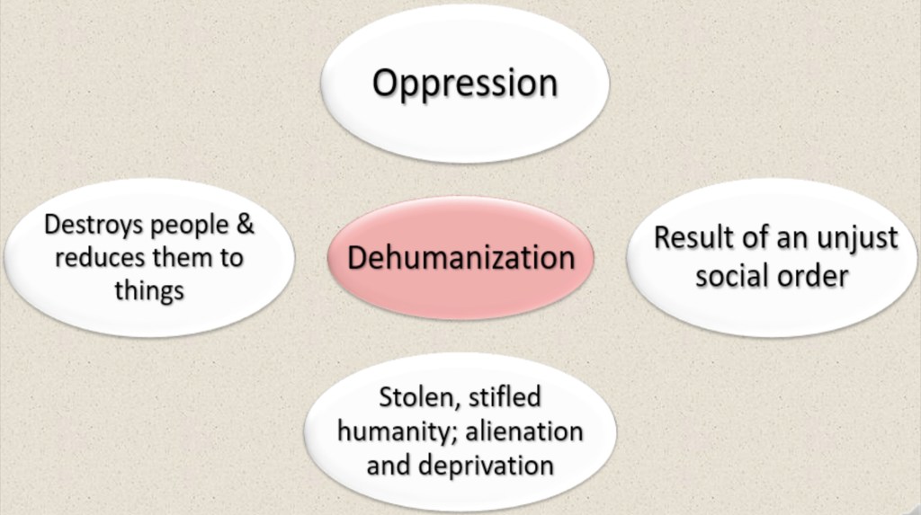Dehumanization is the process of denying someone their full humanity. It is an act that prevents any person from being more fully human. It can be done in various ways, such as through physical or emotional abuse, neglect, or exploitation. It results from an unjust social order that produces violence in the oppressor. It is stolen and stifled humanity that leads to alienation and deprivation. Dehumanization allows for the oppressors, who consider only themselves human, to deprive the oppressed of their power. It destroys the oppressed and reduces them to things leading to feelings of isolation, despair, and hopelessness.