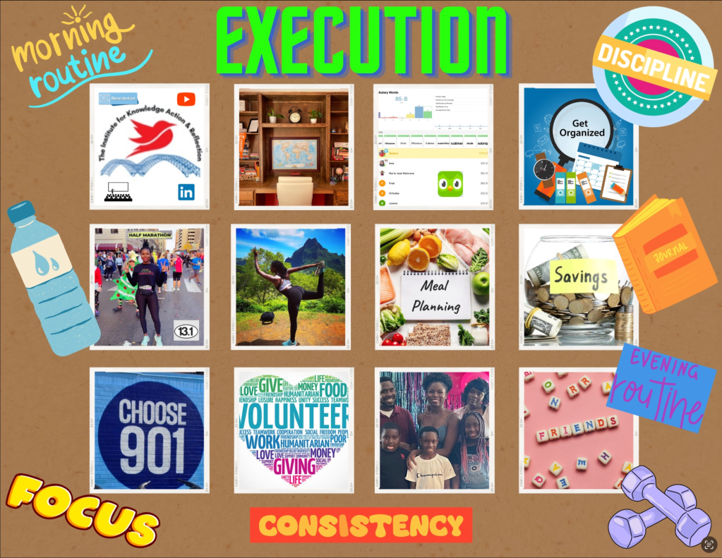 My vision board is a mosaic of squares, each representing a specific, measurable goal aligned with my ideal lifestyle. It’s about consistent, disciplined, and focused action. Whether building my education brand, mastering Spanish, conquering my finances, or strengthening my relationships, each square is a roadmap to execution.