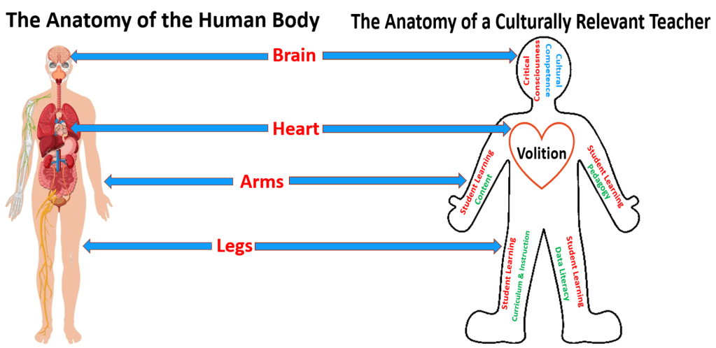 *The Heart: Volition: The human heart is one of the most essential organs in the body. It supports the circulatory system by pumping blood through your veins and arteries. This is how all areas of your body get the oxygen and nutrients they need to survive and thrive! In the context of a culturally relevant teacher, the heart represents volition, which holds a teacher’s desire, passion, motivation, aptitude, and drive to improve student outcomes. The culturally relevant teacher’s heart, aka volition, supports and develops all areas of the teacher’s body.
