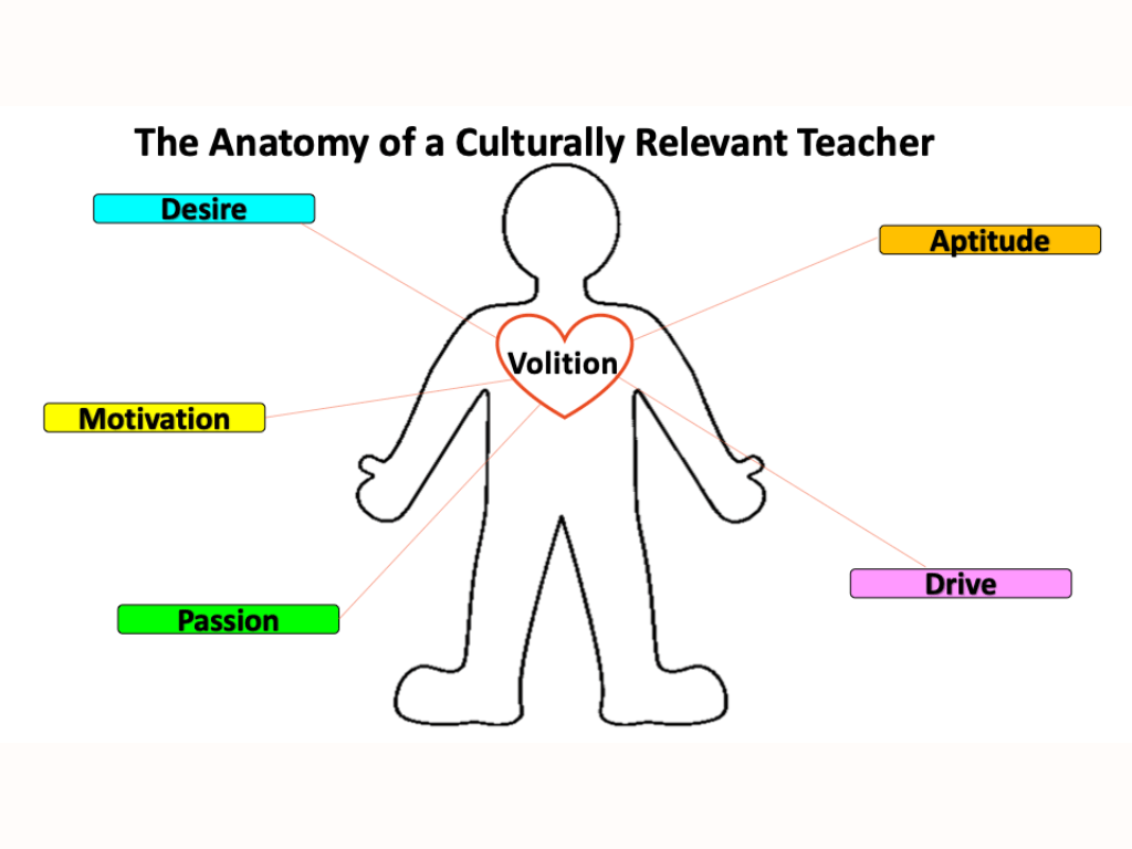 Knowing what the heart does for the human body, let’s consider what volition does for the culturally relevant teacher. Similar to how the human heart stores oxygen and nutrients for the human body, a culturally relevant teacher’s heart, what I call volition, stores a teacher’s will, desire, passion, motivation, aptitude, and drive for teaching. It supports a teacher’s ability to survive, thrive, and improve student outcomes.
