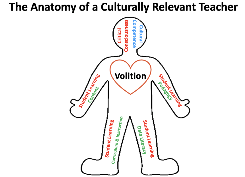 Imagine a culturally relevant teacher as a human body. We’ve discussed the heart (volition), left brain (critical consciousness), and right brain (cultural competence) in previous posts. Now, let’s focus on the body itself, representing student learning.
