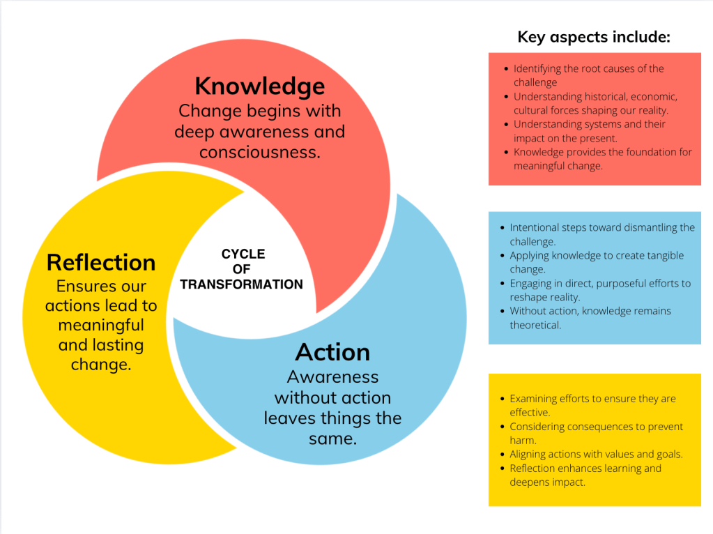 As Paulo Freire teaches, transformation is impossible without a deep understanding of the world and its complexities. Every revolution, whether in education, social justice, or community building, is inherently educational. Meaningful change requires engaging in a continuous cycle of Knowledge, Action, and Reflection. These three interconnected elements ensure that transformation is both intentional and sustainable.